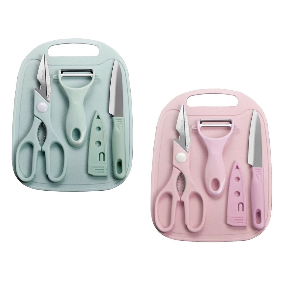 Kit de Utensílios de Cozinha 5 Peças - Faca Tesoura Descascador Tábua - Verde ou Rosa - Culinária - Inox