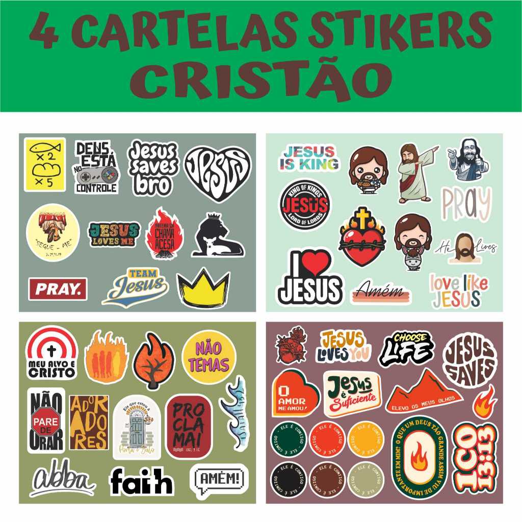 4 CARTELAS Adesivo Vinil Cristão Gospel Jesus para colar Skate, Vidro, Biblia, Caderno, Celular, Tablet, Notebook, Carro, Instrumento (VERDE + MARROM)
