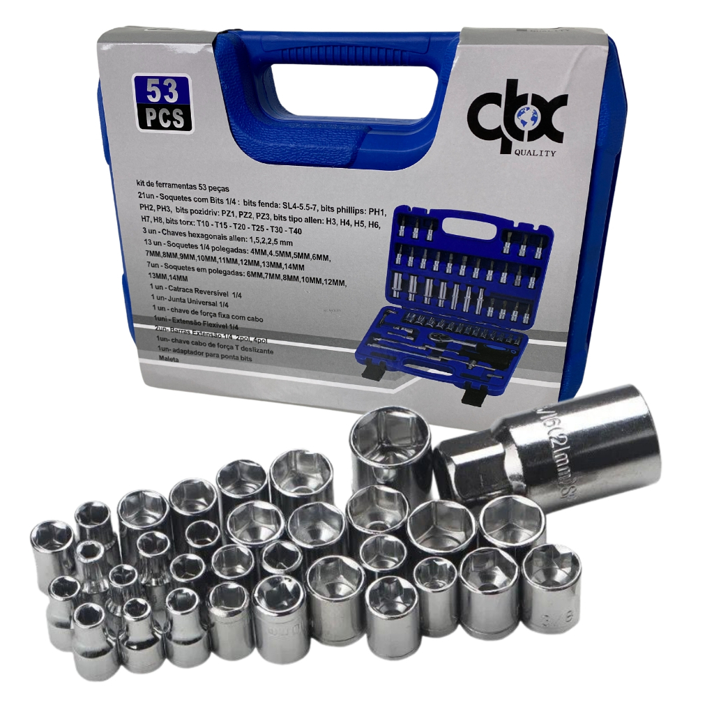 Kit Jogo 53 Peças de Soquetes e Catraca 53 Peças 1/4" com Chaves Allen e Maleta – Aço Cromo Vanádio