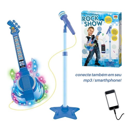 Kit Brinquedo Guitarra Microfone Infantil Som Luz Rock Show Conecta Smartphone MP3