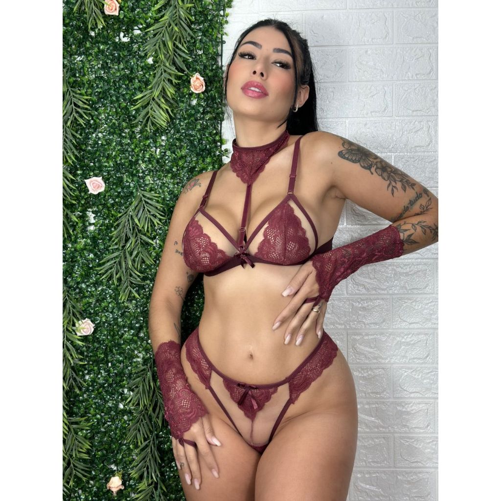 Conjunto Feminino Sutia sem Bojo Calcinha Renda Coleira Luva Lingerie Moda Intima