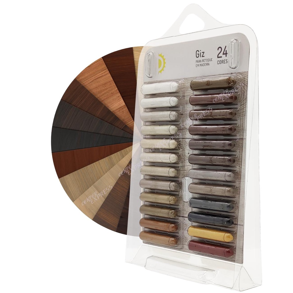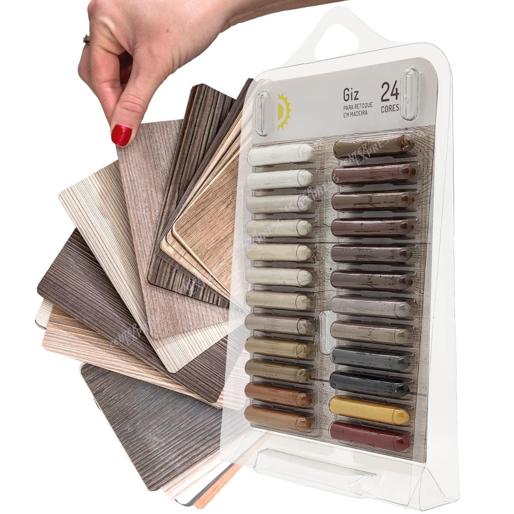 Kit Giz 24 cores Reparo Móveis Madeira Mdf Mdp Verniz Brilho Retoque Tira Riscos Piso Laminado Porta