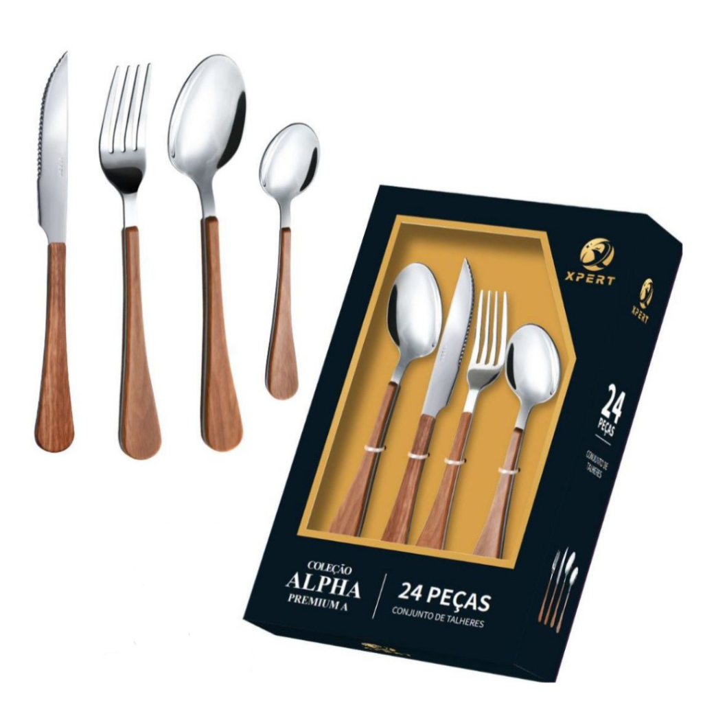 Conjunto de Talheres Premium Cabo Cor Madeira 24 Peças Colher Garfo Faca Kit Talheres Luxo