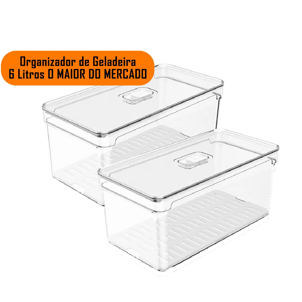 Kit 2 Organizador de Geladeira 6 Litros Bandeja Drenagem Com Tampa Multiuso Alimentos Verduras e Vegetais