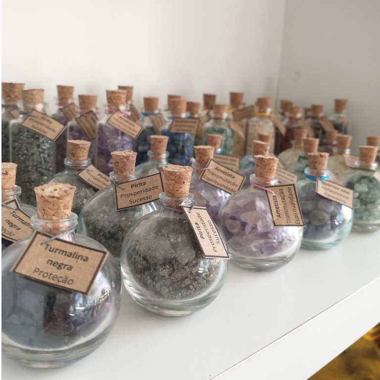 GARRAFINHA COM PEDRAS CRISTAIS NATURAIS FRASCO DE VIDRO BOLINHA E TAMPA ROLHA