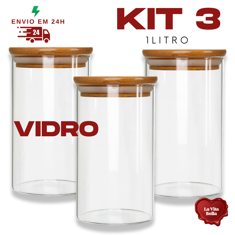 Kit de 3 Potes De Vidro Borossilicato 1 Litro Com Tampa Bambu Hermético Kit 1000ml Alimento