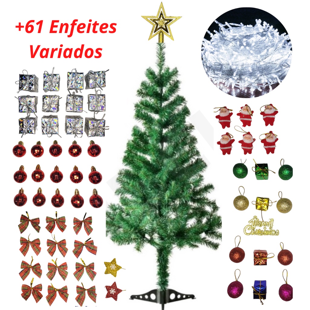 Árvore De Natal Pinheiro 1,20 Metros com 61 Enfeites + Pisca Pisca Para Decorar
