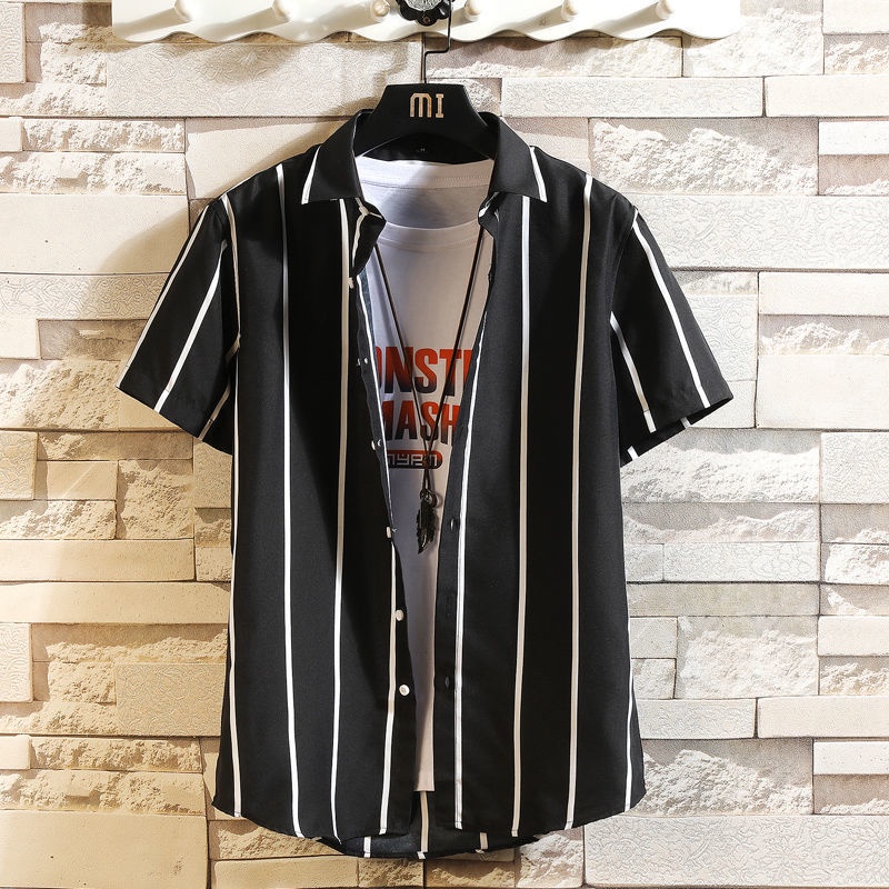 Camisa Masculina Listrada Com Mangas Curtas E Colarinho De Botões Casual Para Verão