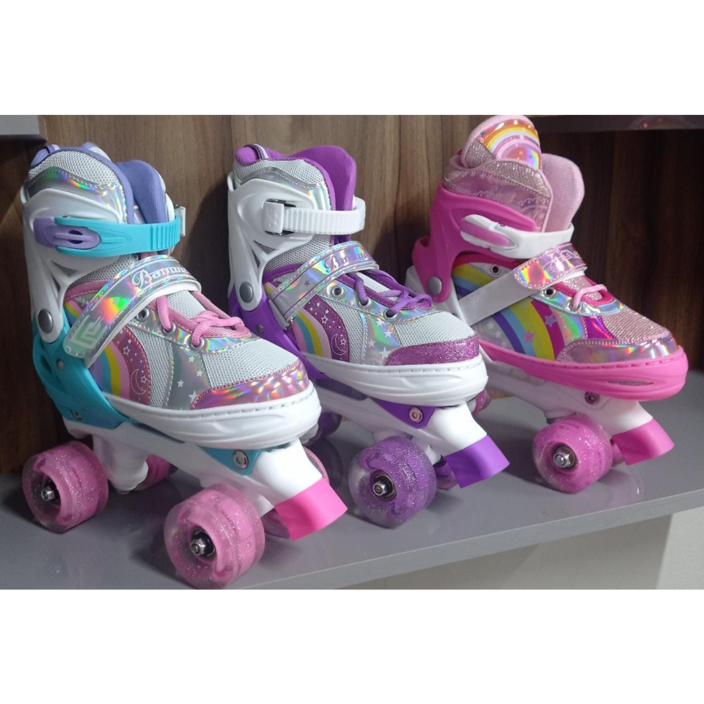 Patins roxo rosa Quad infantil Arco-Íris RainbowStars MeninaTamanho Ajustável 28 ao 32 33 ao 36 e rodas q brilham