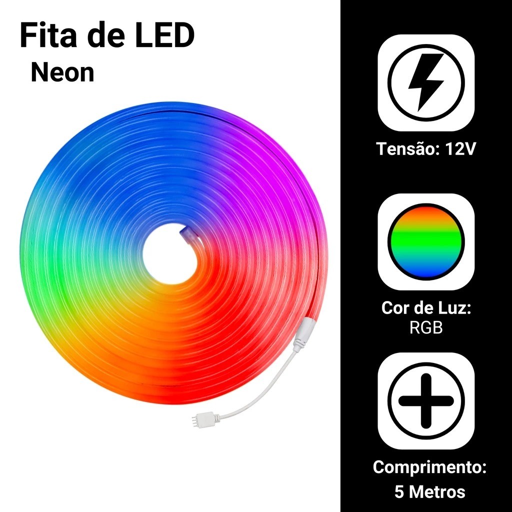 Fita LED Neon RGB 12V 5 Metros Mangueira Flexível + Controle + Fonte 36W