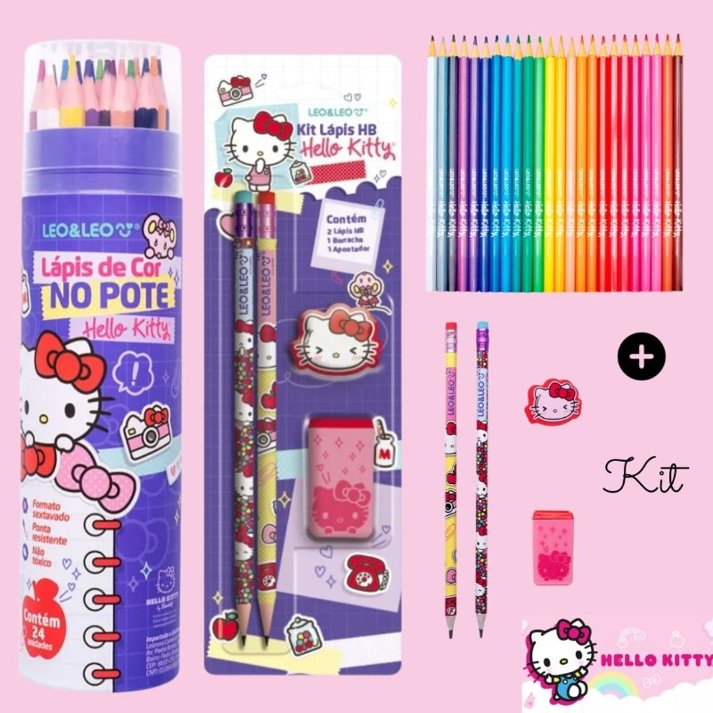 Kit Escolar Hello Kitty Lápis de cor 24 cores com 2 Lápis, apontador e borracha