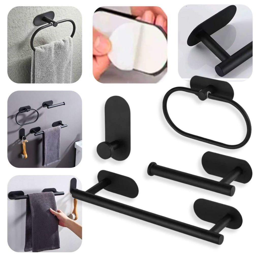 Kit de Acessorios Banheiro Lavabo em Metal Cor Preto c/ Adesivo 4pçs (Porta Toalha Barra, Porta Toalha Argola, Papeleira Porta Papel Higiênico, Gancho Multiuso)