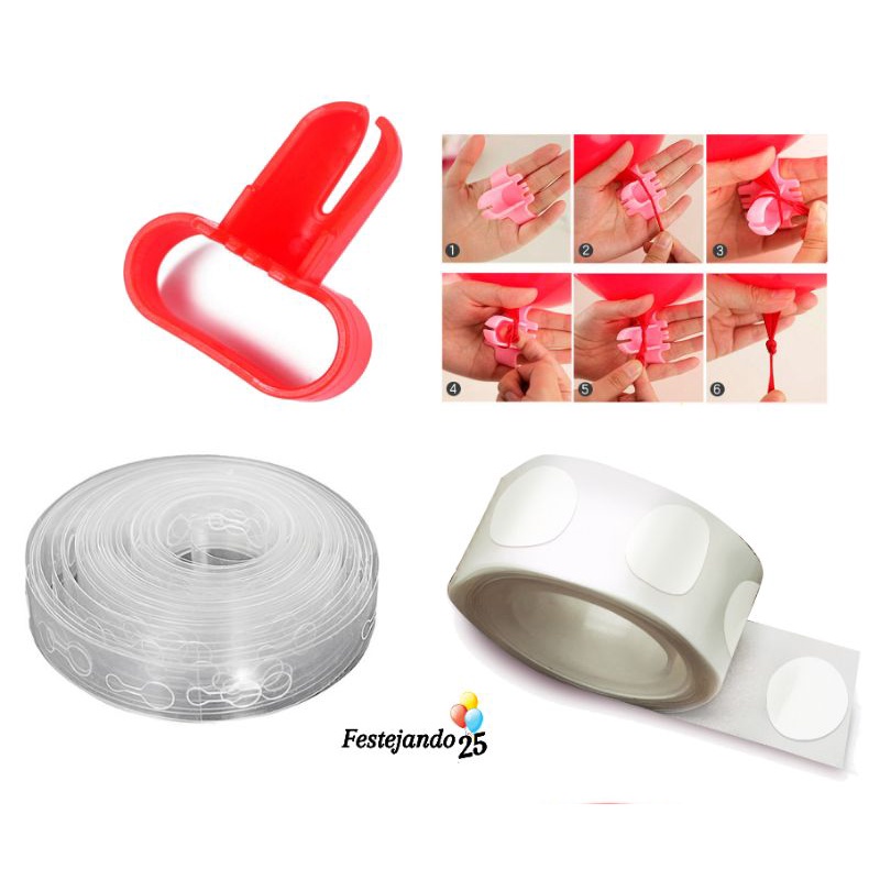 kit Fita Arco de Balões + Cola Balão Gludots 100 pontos + Amarra Bexiga Fácil Acessório de Balões