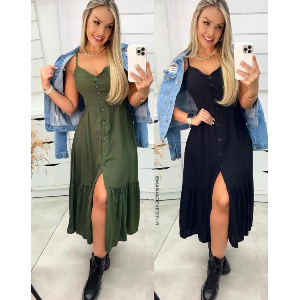Vestido Longo Com Botões A Frente Com Babado e Bojo Elástico Costas Tendencia 2025