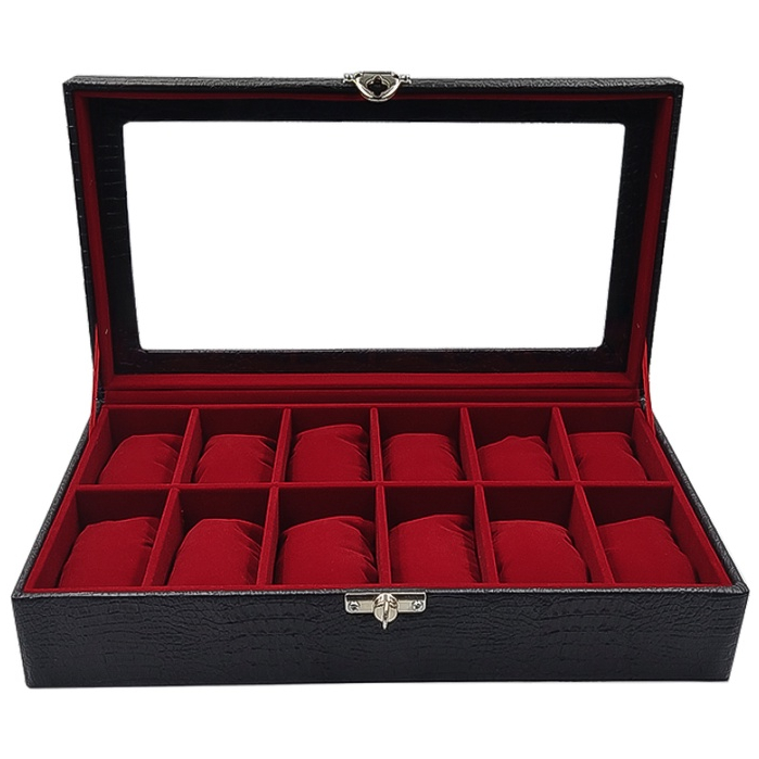 Caixa Estojo para 12 Relógios Preto com Interno Aveludado Vermelho