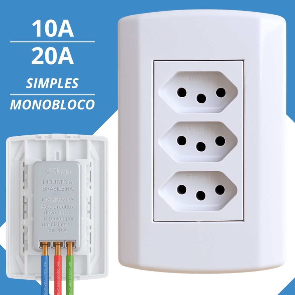 Tomada Tripla 10A 20A Amperes Monobloco Modular 3 Seções C/ Placa 4x2 Pluzie