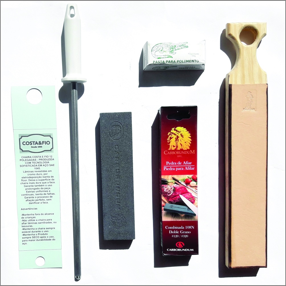 Kit de Afiar Facas Completo com Pedra de Amolar Carborundum, Chaira Profissional Estriada de Afiação, Strop de Couro e Pasta Jacaré Verde Cromo Abrasivo