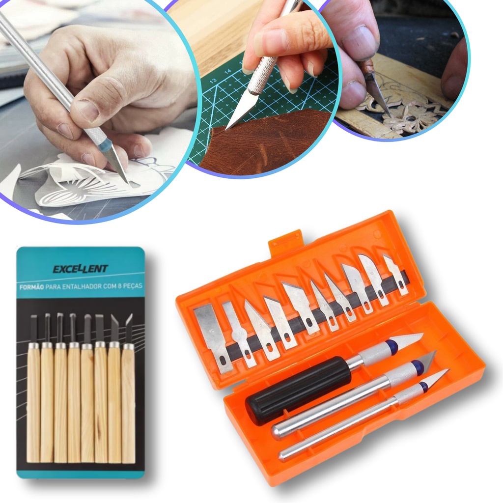 Kit Formão Goiva Esculpir Xilogravura 8 Pç + Estilete Faca Cortador De Precisão Formão Chanfrado Com 3 Cabos E 13 Lâminas Para Madeira Usado em Entalhe Escultura Artesanato Tapeçaria Modelismo Marchetaria
