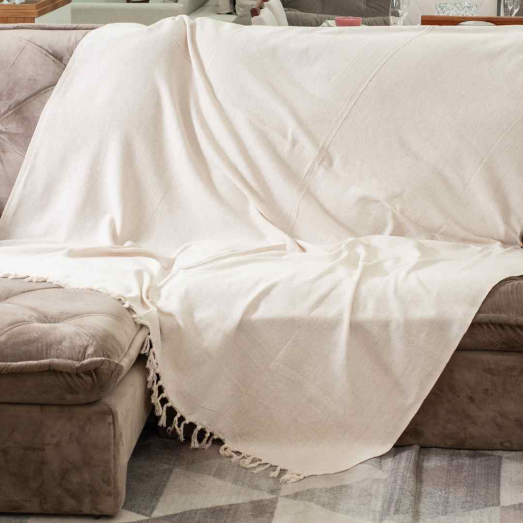Kit Manta Para Sofá Bege Cru C/ Franjas + 2 Capas De Almofadas Luxo