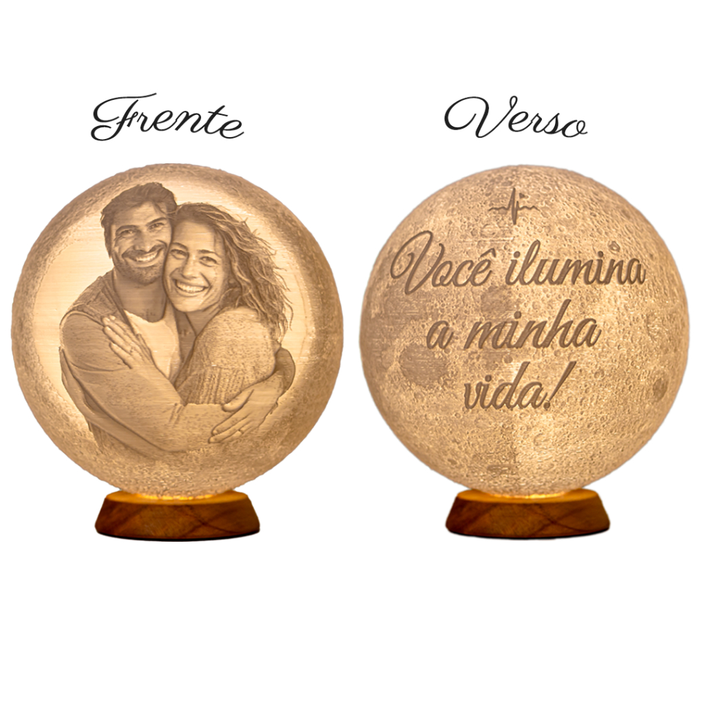 Lua 3D Personalizada Com Foto e Frase - Luminária Presente Romântico Casal Namorados 15cm Branco Quente Decoração