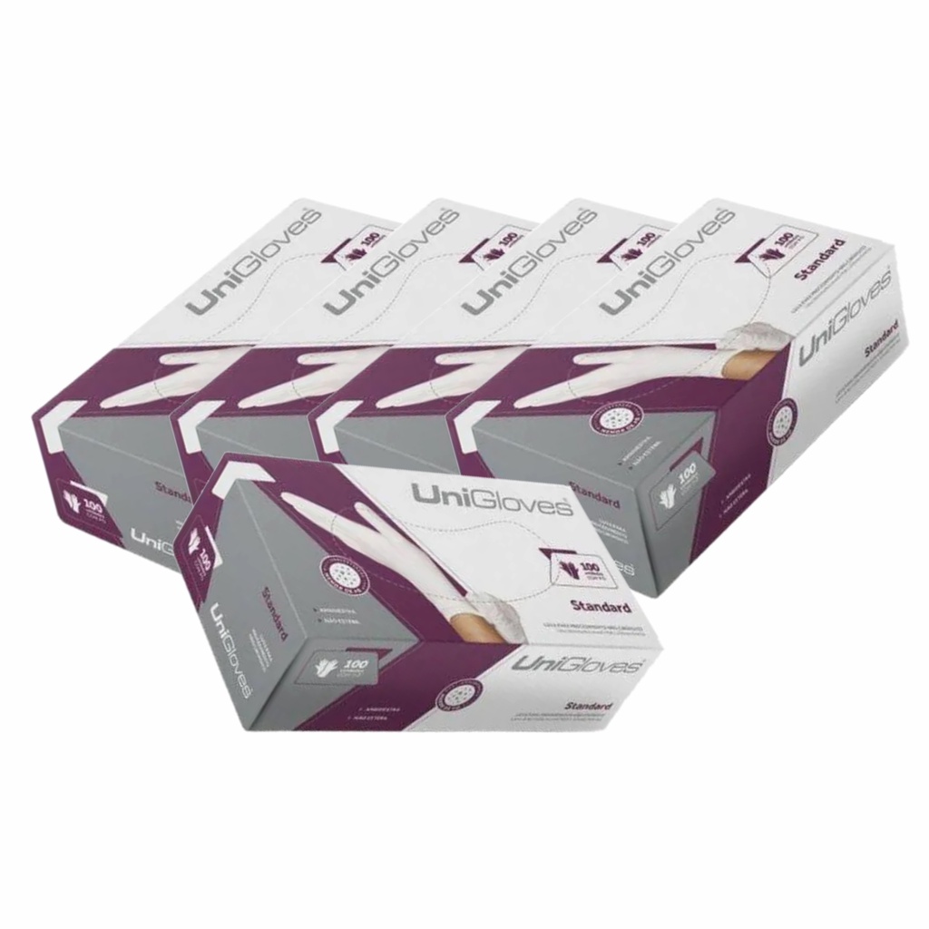 Kit C/500 unds Luva Látex Descartável Standard Branca C/ Pó Unigloves