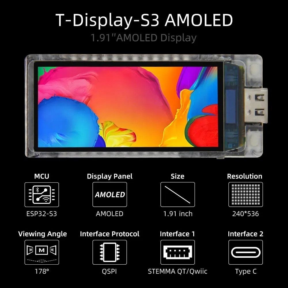 LILYGO ® T-Display-S3 AMOLED ESP32 Conselho De Desenvolvimento De 1,91 Polegadas