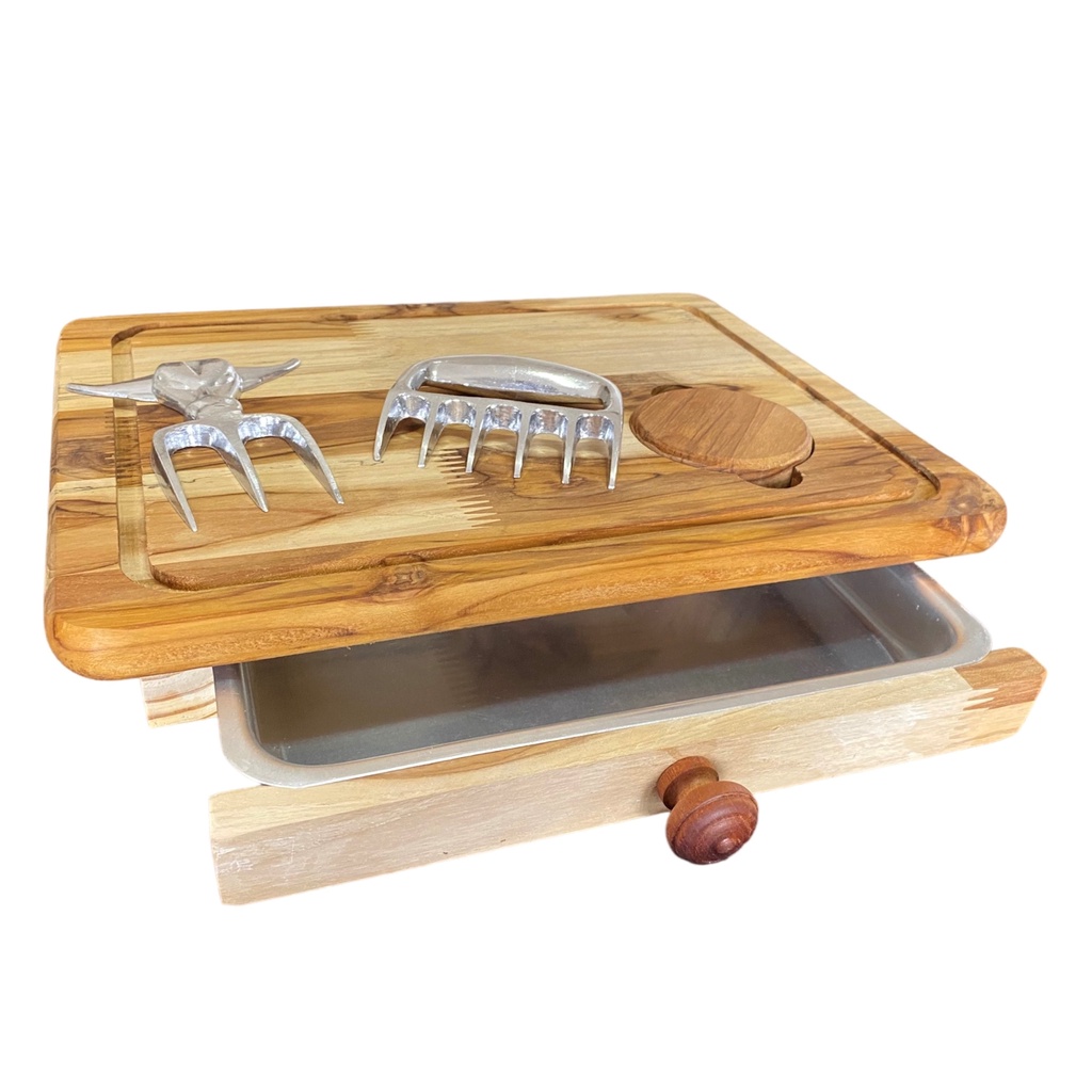 KIT TÁBUA DE CARNE PARA CHURRASCO COM GAVETA, PETISQUEITA E TÁBUA DE COZINHA