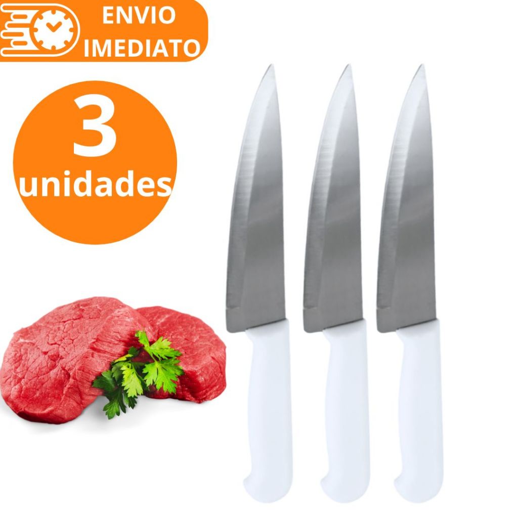 KIT 3 Faca de Churrasco Carne Peixeira Inox de 7" Polegadas Cabo Branco Essencial para Cozinha Resistente