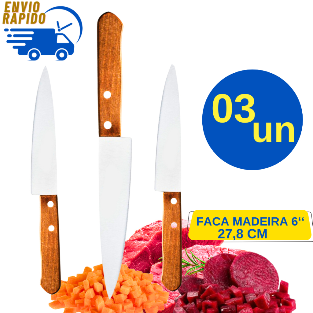 Kit 3 Faca Inox Cabo de Madeira 6 Polegadas Lâmina Inox Para Cozinha Casa Açougue Restaurante