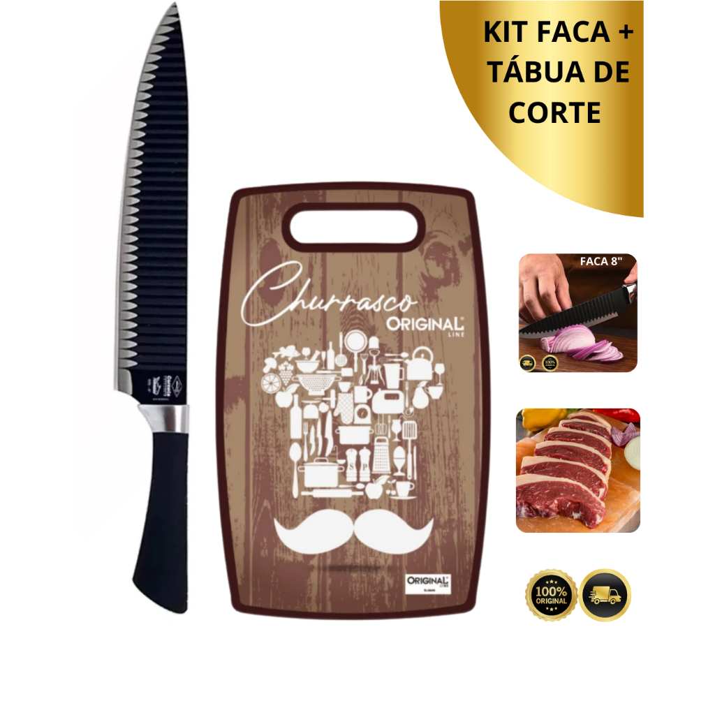 Faca Shark Profissional 8" + Tabua De Corte 37x23 Kit 2 Peças Carne Frango Açougue Cozinha Restaurante Churrasco