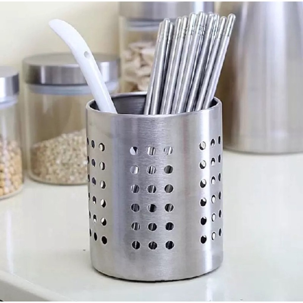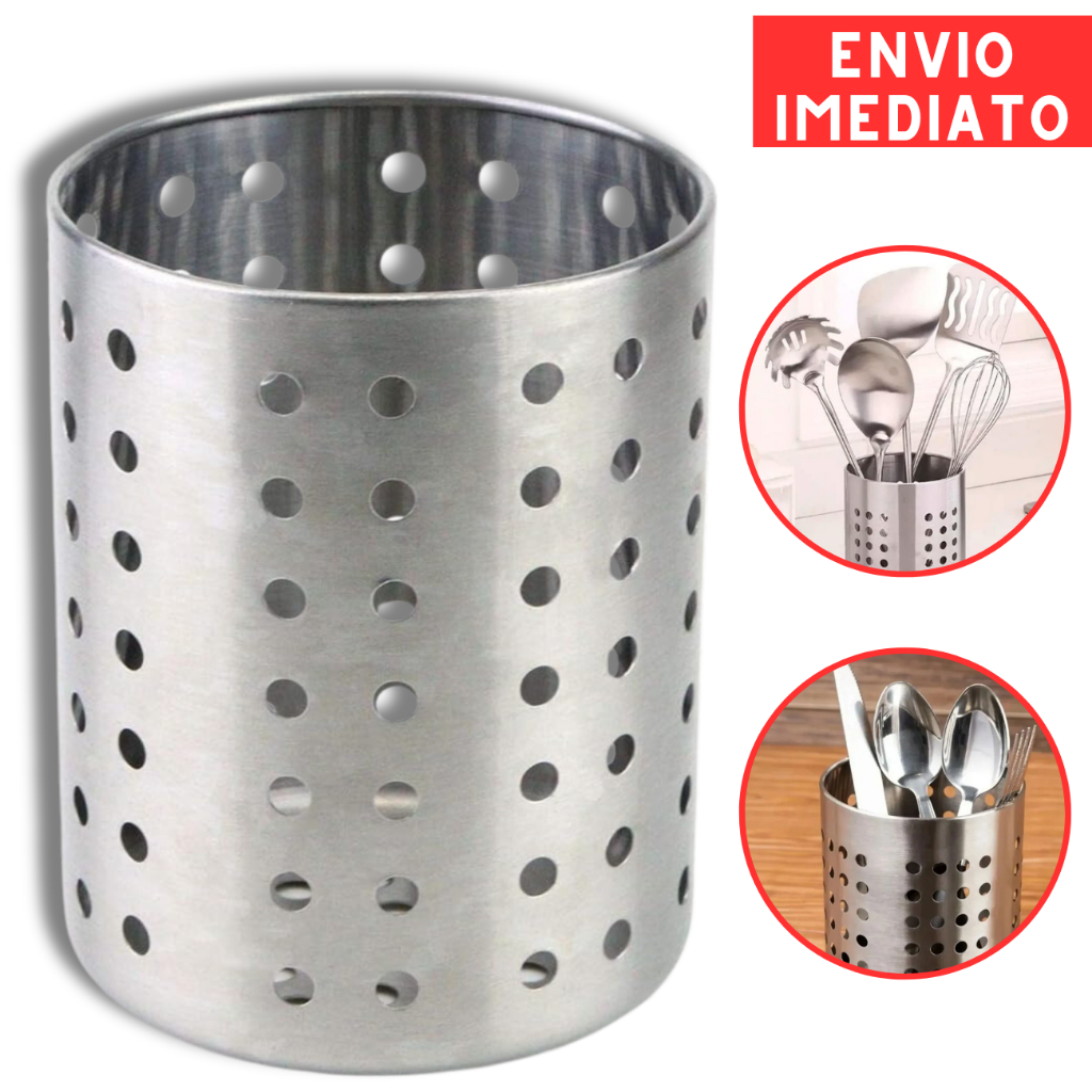 Porta Talheres Utensílios de Cozinha Aço Inox Escorredor Redondo Vazado
