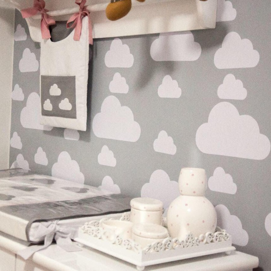 kit com 34 nuvens adesivas distribuídas em 4 medidas para decorar quarto bebe e infantil