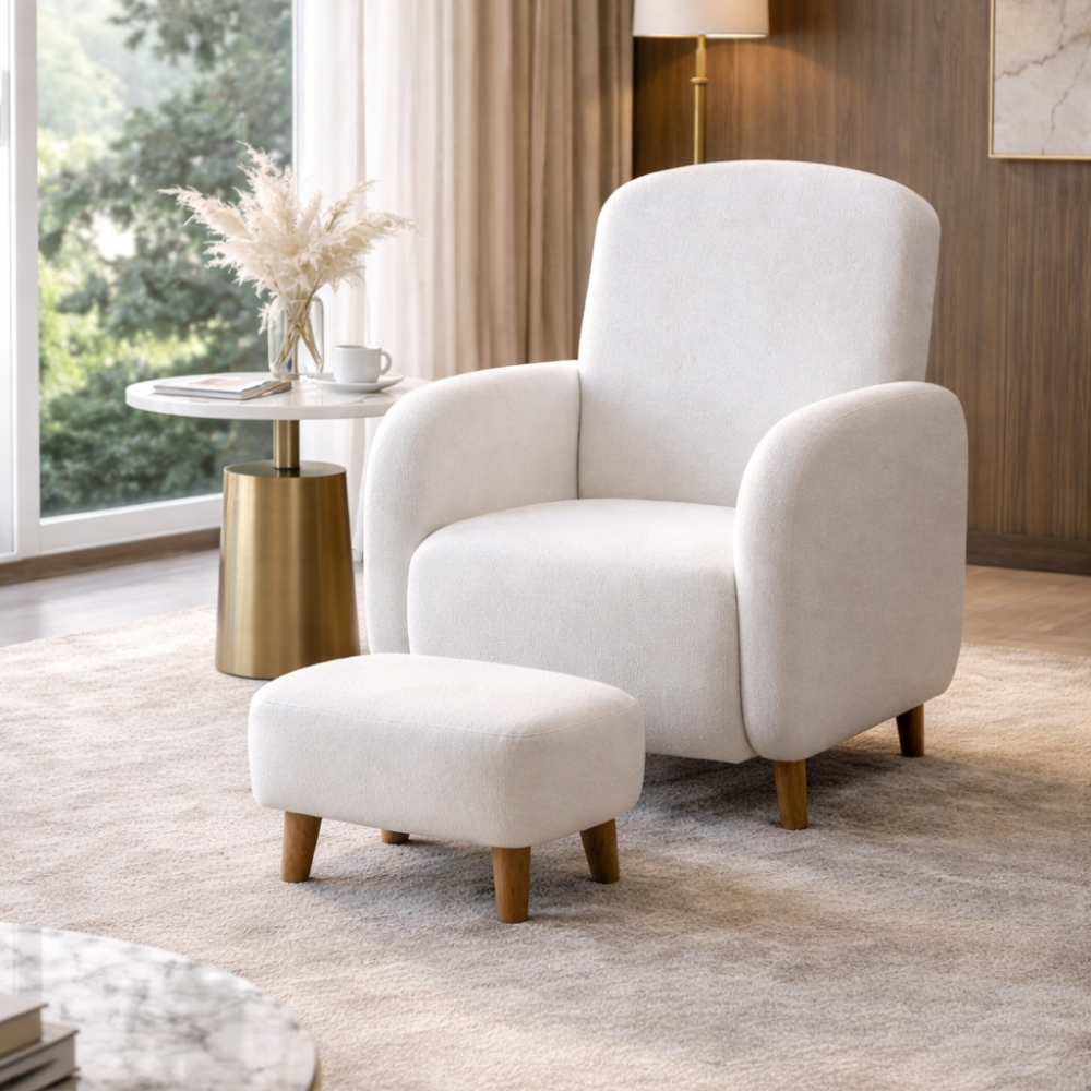 Poltrona Luxo Orgânica Boucle Bege ou Cinza com Puff para Sala Moderna