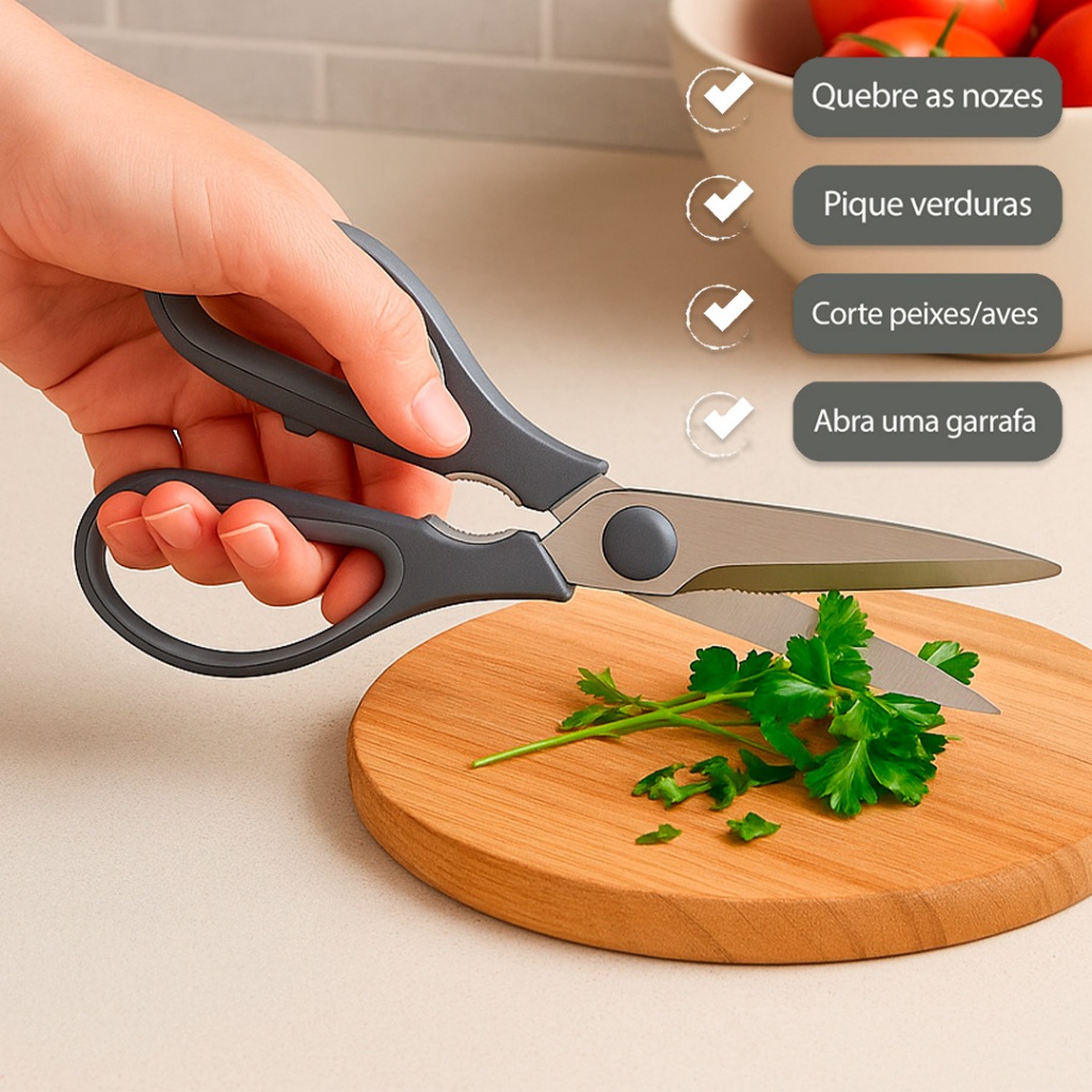 Tesoura de Cozinha 4 em 1 com Capa | Corta Aves, Verduras, Abre Garrafa | Inox Resistente