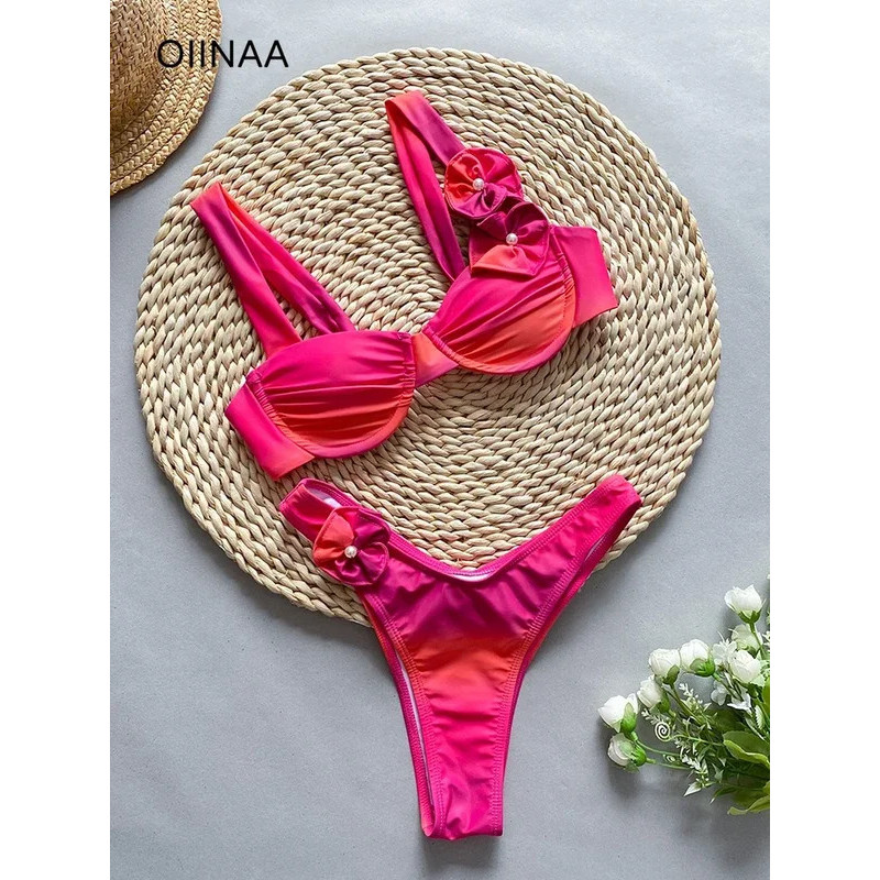OIINAA-Mulheres Sexy Floral Swimsuit Pérola Maiô de Duas Peças Corantes Maiô Dividir Tanga Maiô Verão 3D 2024