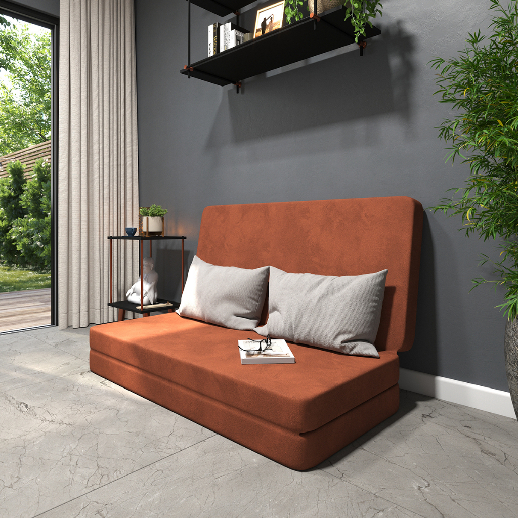 Puff Casal 3 em 1 Tecido Suede Terracota Dobrável Estilo Moderno Todos os Ambientes
