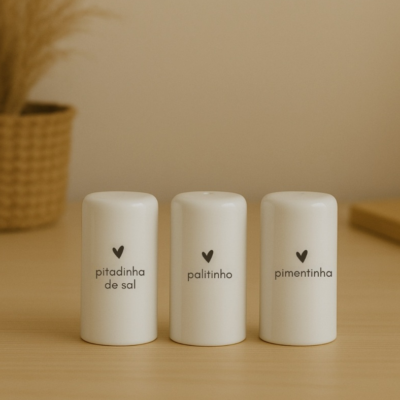 Kit porta temperos Saleiro, Paliteiro e Pimenteiro de mesa em porcelana branca mini
