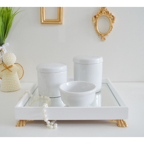 Kit Higiene Porcelanas Bebê K152 Moderno Resina Dourada Bandeja Espelho Quarto Promoção