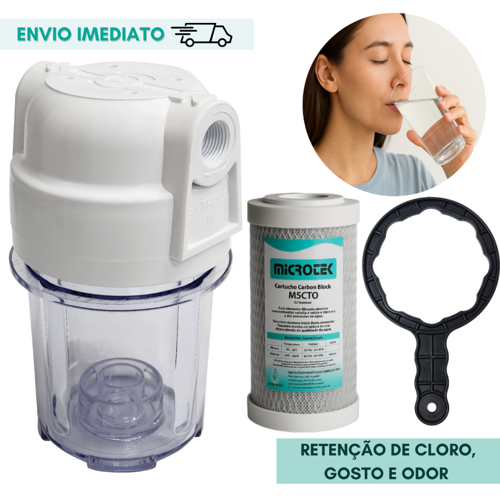 Filtro de Água Kit Completo 5" Refil Carvão Ativado Remove Cloro Retira Odor Purificador