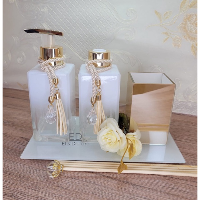 Kit Banheiro Lavabo Luxo Branco Com Bandeja Porta Escova Aromatizador De Varetas/Saboneteira