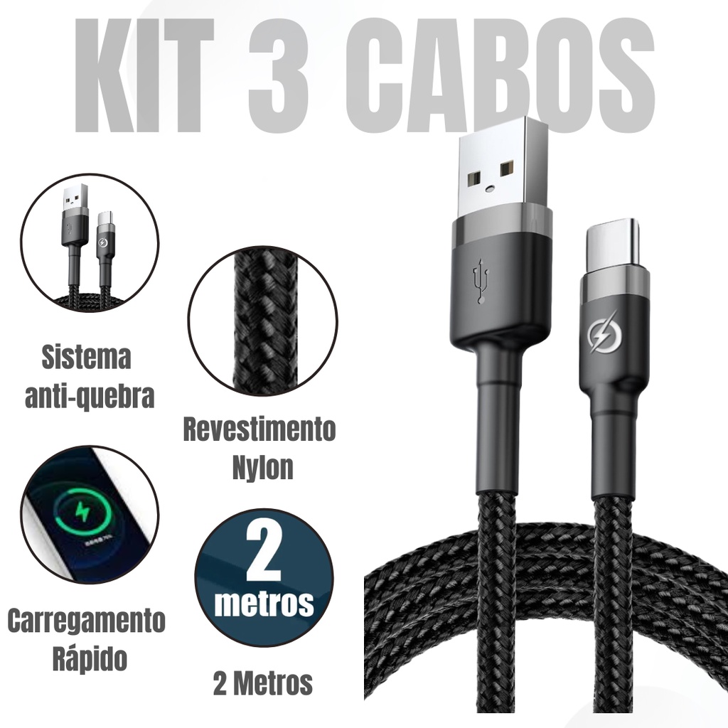 Kit 3 Cabos Tipo C Usb Carregador Rápido 2 Metros Resistente