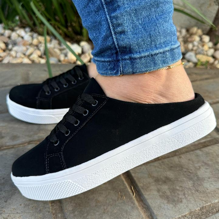 Tênis Feminino Meia Calce Fácil Babuche Casual Básico Mule Slip On Preto