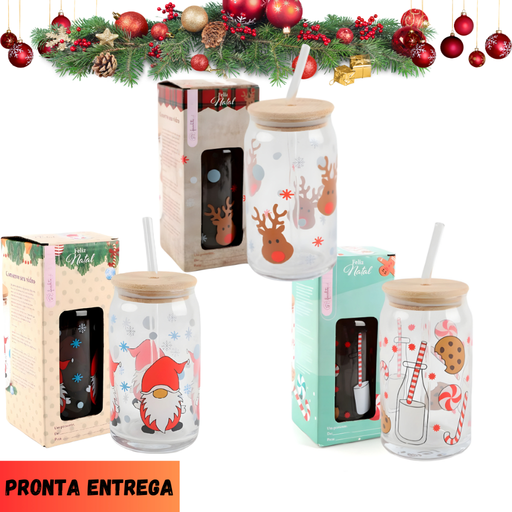 Kit 4 Copos de Vidro Natal com Tampa de Bambu e Canudo de Vidro Enfeite 500 ML Pronta Entrega