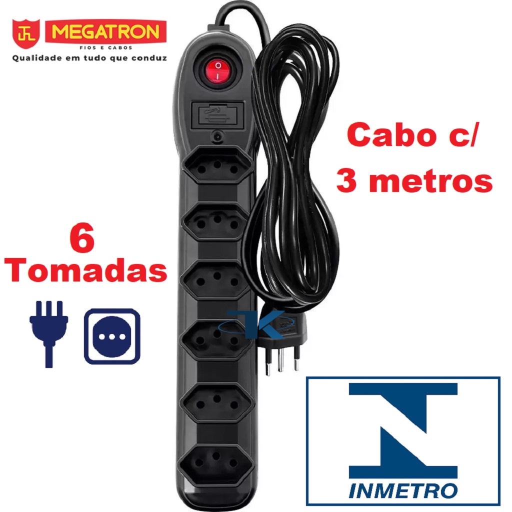 Filtro de linha / régua tripolar Megatron (INMETRO) - Bivolt 10A - 6 tomadas - Cabo 3 metros