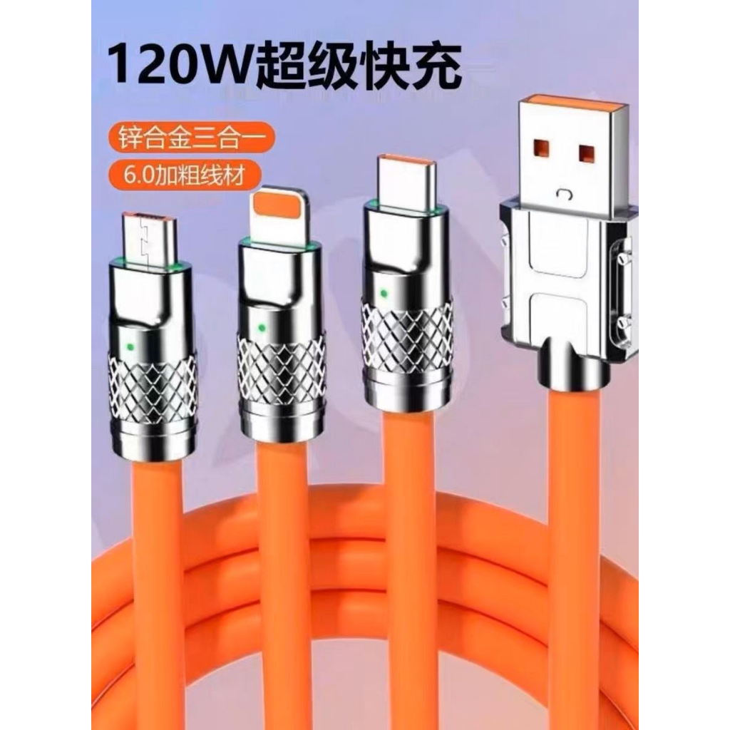 1.2M Cabo De Carregamento De Liga De Zinco 3 Em 1 120W 6A Carga Super Rápida USB Para Android IOS Tipo C