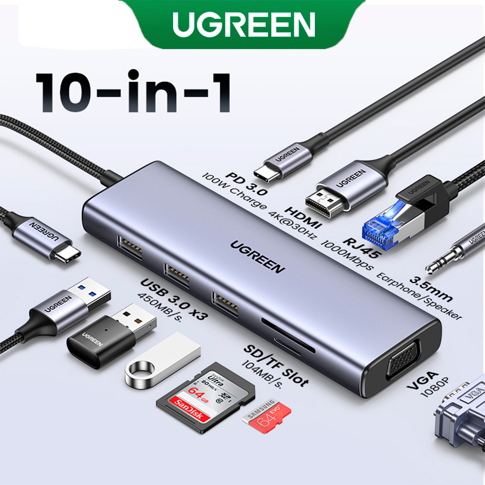 【 Upgraded Version 】 Ugreen Hub 10 Em 1 USB C HDMI Adaptador VGA 4k 30Hz Para 3.0 Dock De Carregamento Rápido De 100W Suporte A Macbook Pro Cartão SD TF E Porta 1000Mbps RJ45