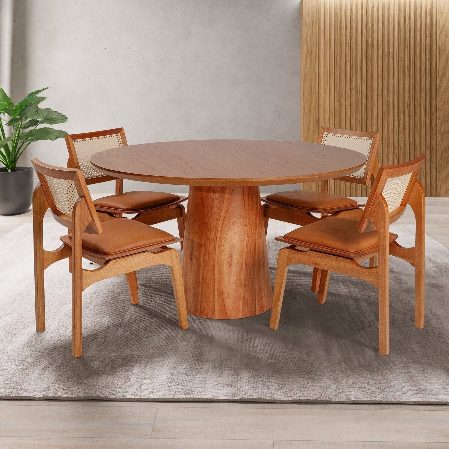 Conjunto Mesa com 4 Cadeiras de Madeira Maciça Rattan Natural e Estofada Daren Espresso Móveis