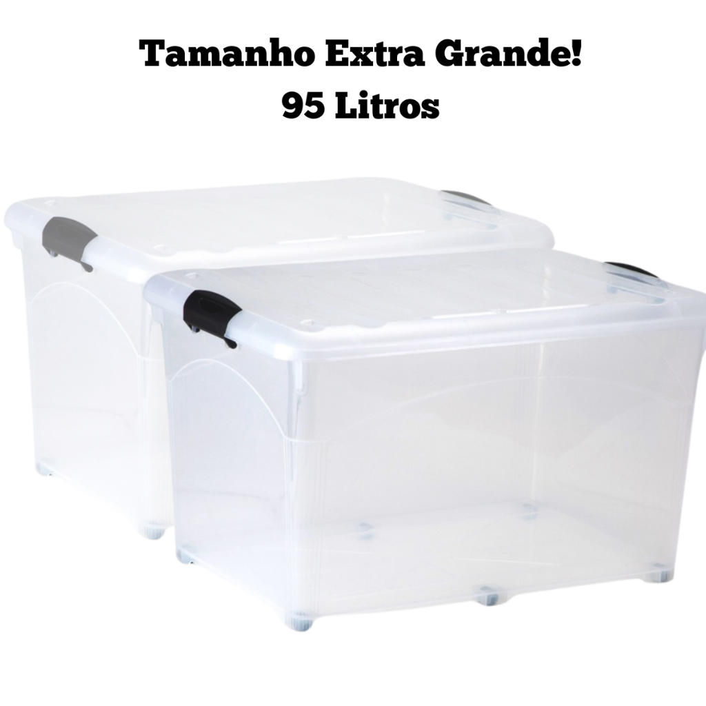 Conj 1 e 2 Caixas Organizadoras 95 Litros Transparente- Trava e Rodinha