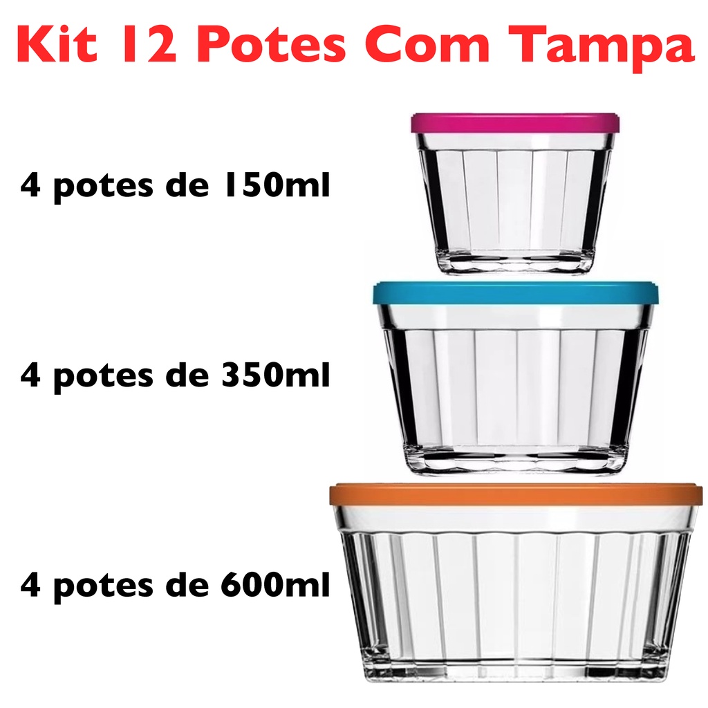 Kit 12 Potes De Vidro Americano Com Tampa - 4x150ml, 4x350ml e 4x600ml - Nadir Figueiredo