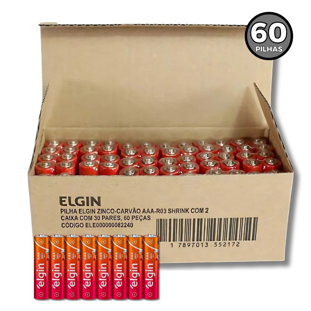 Kit 60 Unidades Pilhas Elgin Zinco Carvão AAA Palito 3A Comum